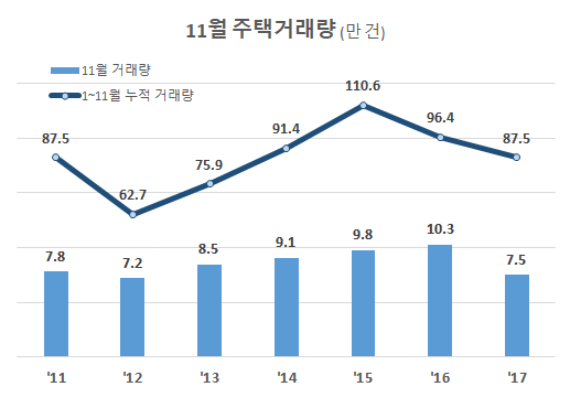 최근 5년간 11월 한 달 거래량의 추이를 보면 ‘11년 7.8만건에서 이듬해에 7.2만건으로 줄었다가 ‘13년 8.5만 건에서 증가하기 시작해 ’14년 9.1만건, ‘15년에 9.8만건, ’16년에 10.3만 건으로 정점을 기록한 후 올해 7.5만건으로 급감해 2011년 이후 가장 적었던 것으로 집계됐다.