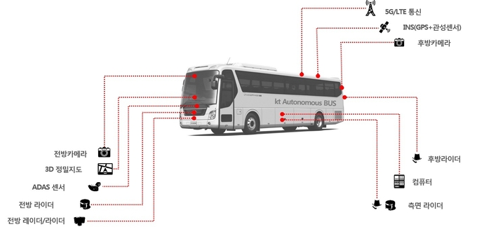 특히, KT의 대형 자율주행 버스는 차체 길이가 12m, 차량폭이 2.5m에 달하는 45인승 차량이다. 일반도로의 최소 차선 폭인 3m를 유지하면서 대형버스를 운행하기 위해서는 좌우로 한 뼘(약 25cm) 내에서의 정교한 제어가 필요하다. KT는 소형버스에 비해 더욱 커진 대형버스의 완벽한 운행 제어를 위해 5G와 LTE 네트워크 기반 V2X(Vehicle-to-everything) 자율주행 방식을 도입했다.