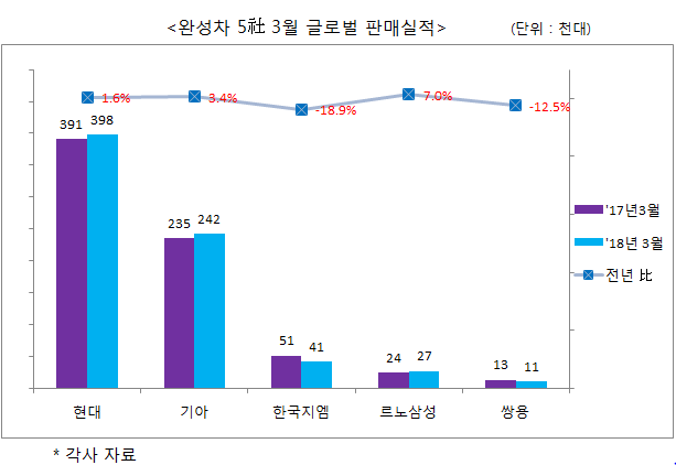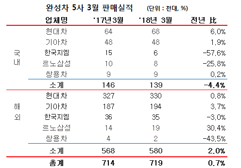[산업경제뉴스 김대성 기자] 현대자동차, 기아자동차, 한국지엠, 르노삼성, 쌍용자동차 등 완성차 5사의 지난 3월 총 판매량은 71만9천대로 지난해 같은 달보다 0.7% 증가했다.
