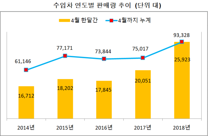 4월까지 집계한 최근 5년간 추이를 비교해보면, 2014년 6만 1146대에서 이듬해는 7만7171대를, 이후 꾸준히 성장하여 올 4월에는 9만3328대 판매를 기록하며 5년 전보다 3만2182대(52.6%)나 더 팔린 것으로 나타났다.