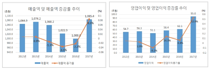 두 회사의 매출을 제외하면 나머지 회사들은 2016년 보다 매출은 5.2%, 영업이익은 2.9% 증가에 그쳤다.