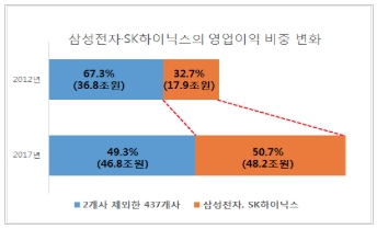 두 회사가 전체 상장사에서 차지하는 비중은 매출이 17.7%, 영업이익이 50.7%로 집계돼 영업이익의 경우 2개 회사의 이익이 나머지 437개 회사의 이익보다 많았다.