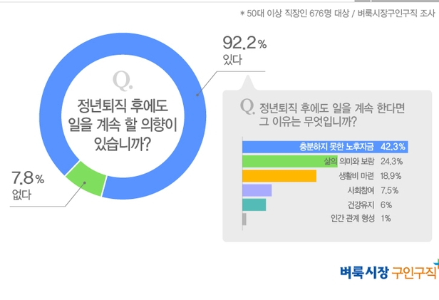 [산업경제뉴스 김명인 기자] 은퇴하지 않은 50대 이상 장년층 직장인 10명 중 9명은 ‘정년퇴직 후에도 일을 계속할 의향이 있다’고 답해 퇴직 후에도 노동시장을 떠나지 않고 경제활동을 지속하는 ‘반퇴’를 자처하는 것으로 나타났다. 반퇴란 장기간 종사한 직장이나 직업에서 퇴직한 후 경제적인 이유로 다시 경제활동에 뛰는 드는 현상을 말한다.