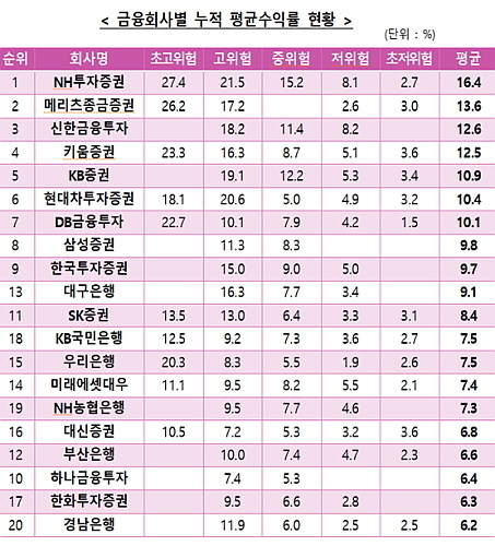 반면에 누적 평균수익률 하위권으로 나타난 하나금융투자 6.4%, 한화투자증권 6.3%, 경남은행 6.2% 등 3개사는 상위권 3사 수익률 대비 절반 수준에 그쳐 대조를 보였다.