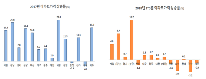한국감정원의 지역별 아파트가격 동향을 살펴보면 지난해에는 강남과 함께 부산, 세종, 제주 등 지방 주요 지역의 아파트 가격이 상승세를 보였다. 하지만 부동산규제가 계속 강화되고 있는 올해로 들어 오면서 강남과 분당만 상승세를 유지할뿐 나머지 지역은 모두 상승이 멈췄거나 하락세로 전환된 것으로 나타났다.