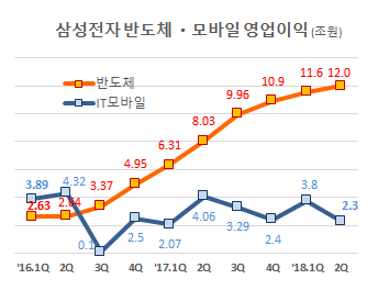 반도체 부문의 영업이익은 2016년 1분기 2.6조원에 그쳤지만 2016년 하반기부터 세계적인 반도체 수요증가에 힘입어 큰 폭으로 증가했다. 이번 2분기에는 12조원(증권업계 추정)까지 뛰어 오르며 5배 가까운 증가세를 보였다.