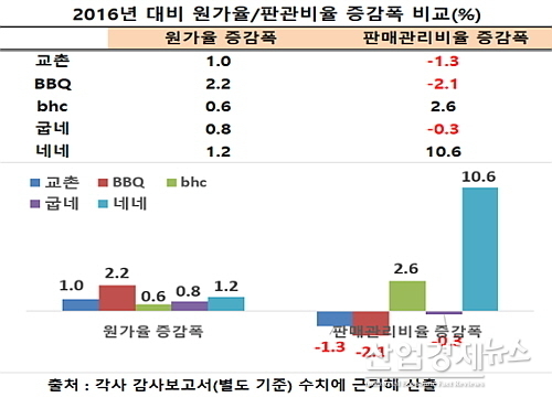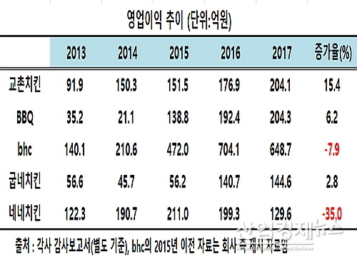 [산업경제뉴스 민혜정 기자] 교촌, bhc, BBQ, 굽네, 네네 등 외형 기준 국내 치킨 프랜차이즈 빅5의 지난해 수익성이 같은 영업환경에도 불구하고 외형에 이어 각 사별로 명암이 또 다시 교차한 것으로 나타났다.