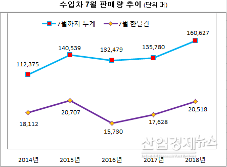 수입차의 올 7월까지 누적판매량은 지난해 같은 기간 보다 18.3% 증가한 16만627대를 기록했다.