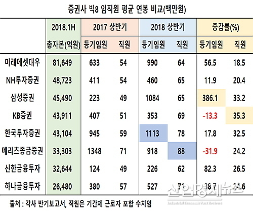 [산업경제뉴스 민혜정 기자] 올 상반기 자기자본 및 매출액 기준 국내 증권사 빅8의 평균 연봉이 직원은 메리츠종금증권, 또 주요 경영진(등기임원)의 경우는 한국투자증권인 것으로 밝혀졌다.