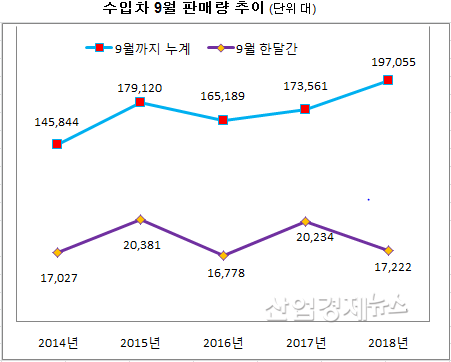 이 수치는 올 1월부터 지난달까지 월별 판매수량 중 최저치인 것으로 나타났다. 그러나 9월까지 누적판매량(19만7055대)은 지난해 같은 기간 보다 13.5%가 증가한 것으로 집계됐다.