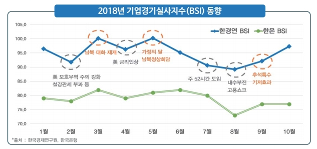 이날 세미나에서 첫 번째 발제를 맡은 김윤경 한국경제연구원 기업연구실장이 제시한 '2018년 기업경기실사지수 동향'에 따르면 기업들이 현장에서 느끼는 체감경기는 지난 8월 89.2를 기록한 뒤 9월에 92.2, 10월 97.3으로 수치가 증가한 것으로 나타났다.