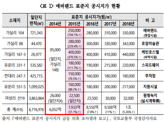 즉, 원래 1개였던 에버랜드 내 표준지를 절차까지 위배해가며 7개로 변경한 뒤, 유독 면적이 넓은 하나의 표준지만 현저히 낮은 공시지가를 책정했고, 이를 다시 2016년 개별공시지가 하락의 근거로 사용한 ‘꼼수’를 부린 것이라고 참여연대는 설명했다.