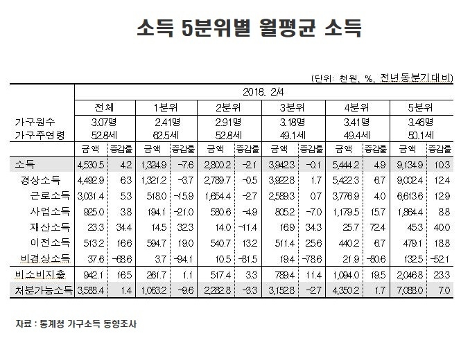 통계청이 발표한 '2018년 2/4분기 가계 소득 동향조사'에 따르면 우리나라 가구당 월평균 소득은 453만원으로 조사됐다.