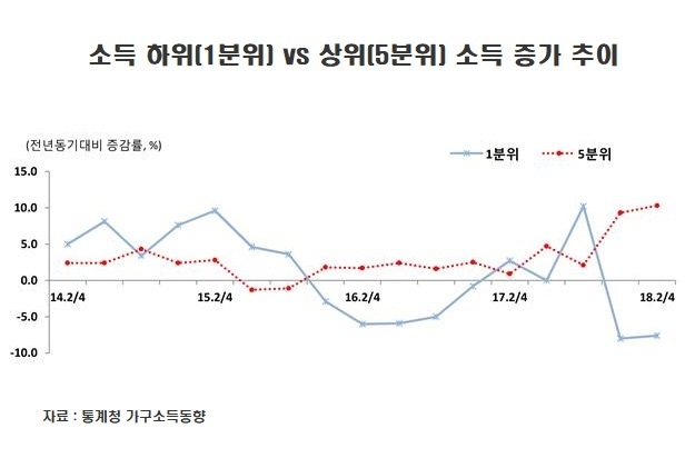 특히, 소득의 증감률은 1분위가 7.6% 감소한 반면, 5분위는 10.3% 증가한 것으로 나타났다. 중간분위인 3분위도 소득이 0.1% 감소했다.