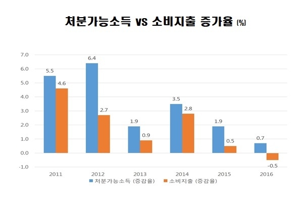 한국경제연구원(이하 한경연)이 통계청 자료를 분석한 자료에 따르면 소득 감소세보다 소비지출 감소세가 더 큰 것으로 나타났다. 지난 5년 동안의 소득 증가율은 5.5%에서 0.7%로 작아졌는데 소비지출 증가율은 4.6%에서 마이너스 0.5%로 떨어졌다.