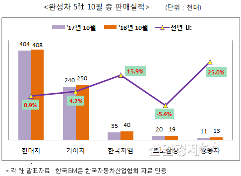 [산업경제뉴스 김소산 기자] 현대자동차, 기아자동차, 한국지엠, 르노삼성자동차, 쌍용자동차로 대표되는 완성차 5사의 지난달 총 판매량은 지난해 같은 달 보다 3.0% 성장 한 것으로 나타났다.