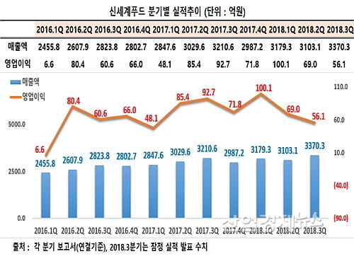 [산업경제뉴스 민혜정 기자] 신세계·이마트그룹 식자재유통(단체 급식 포함) 기업 신세계푸드가 올 3분기 외형 성장에도 불구, 영업이익이 전년 동기대비 39.5%나 급감한 어닝쇼크를 기록, ‘속빈강정’식 영업을 한 것으로 밝혀졌다.