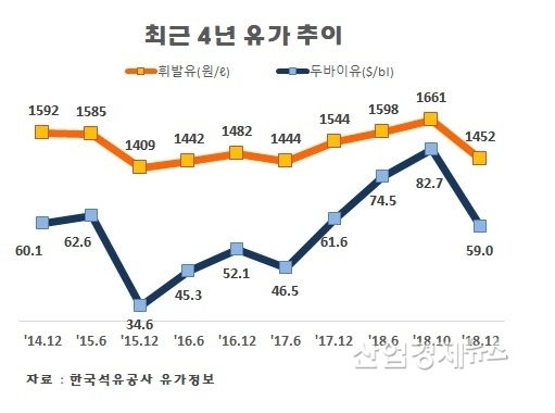 하지만 지난 10월 까지 상승세를 타던 유가가 최근 급락세를 보이고 있다. 배럴당 82.7 달러까지 치솟았던 두바이유는 12월 11일 현재 59.0 달러에 거래됐다. 한 달 사이 29%나 떨어졌다.