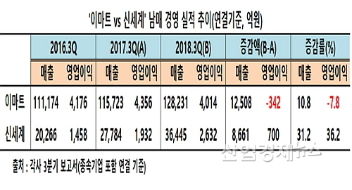 2018 3Q 누적 연결 매출 증가율, ‘이마트 10.8% vs 신세계 31.2%’...신세계 웃어