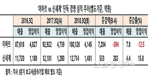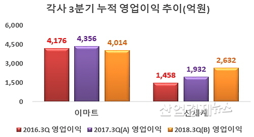 비교 기간을 남매 분리경영이 시작된 2016년 3분기로 넓혀 보면, 이마트가 2016년 3분기 4176억 원의 연결영업이익에서 2018년 3분기 4014억으로 161억이 줄어 약 3.9% 감소했고, 연평균으로는 약 1.9%씩 역 신장했다.