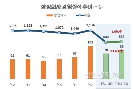이 보고서에 따르면 지난해 상장사들의 3분기까지 매출액은 865조원으로 전년 동기 매출액 849조원보다 1.9% 증가했다. 제자리걸음 수준이지만 그래도 증가하는 모습을 보였다.