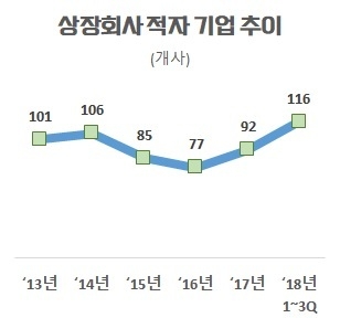 상장회사 가운데 지난해 3분기까지 적자가 난 회사수는 116개사로 조사됐다.