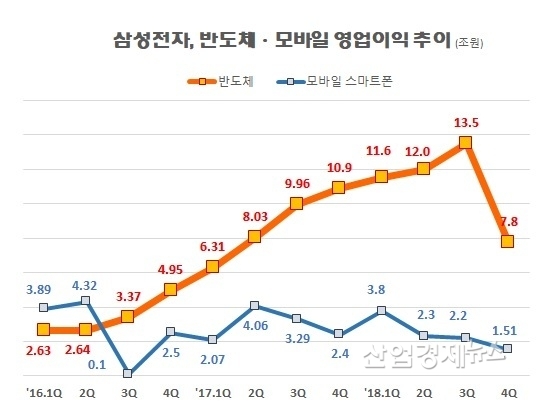 반도체 부문의 영업이익은 지난 3분기 13.5조원에서 4분기에 7.8조원으로 급감하면서 42.2%의 하락세를 보였다. 3년 전 2조원 대의 영업이익에서 분기마다 신기록 행진을 벌이며 지난해에는 10조원을 훌쩍 넘겼지만 한 분기만에 다시 2017년 수준으로 감소했다.