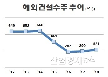 한국 건설의 수주 텃밭인 중동지역의 수주가 최근 4년 313억 달러에서 92억 달러로 3분1 수준으로 급감하면서 우리 건설사들의 전체 수주실적도 4년 전 660억 달러에서 321억 달러로 반토막이 났다.