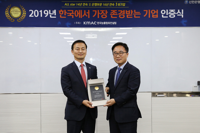 [산업경제뉴스 김명인 기자] 신한은행은 한국능률협회컨설팅에서 실시한 ‘2019년 한국에서 가장 존경받는 기업’ 조사에서 16년 연속 은행산업부문 1위 및 14년 연속 All star(전체 기업 중 상위 30위 기업) 기업으로 선정됐다고 19일 밝혔다.