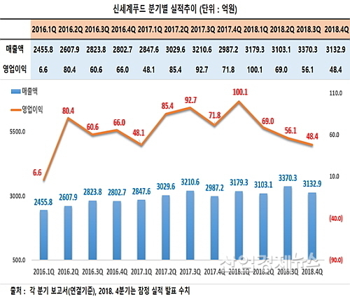 신세계푸드가 최근 공시한 지난해 잠정영업실적에 따르면, 연결재무제표 기준 매출은 1조2785.7억 원으로 전년 동기 1조2075.1억 보다 약 5.8% 증가해 사상 최대치를 기록한 반면에, 영업이익은 273.6억 원을 기록, 2017년 298.1억 원과 비교해 약 8.2% 줄었다.