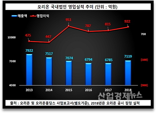 오리온과 지주회사인 오리온홀딩스의 2013년 이후 사업보고서와 2018년 잠정실적 공시자료 및 증권사 보고서에 근거, 이 기간 중 국내법인 영업실적을 분석해본 결과,