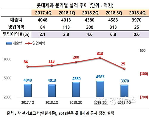[산업경제뉴스 민혜정 기자] 국내 제과업계 리딩기업 롯데제과의 지난해 4분기 영업이익이 전년 동기대비 70%나 급감한 ‘어닝쇼크’를 기록한 것으로 밝혀졌다.