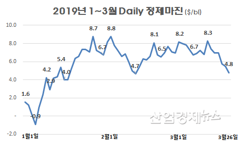 이후 1월 말에서 2월 초까지 정제마진은 7~8달러 선까지 치솟았지만 2월 중순부터 다시 하락해 3월 하순으로 가면서 4달러 선까지 떨어졌다. 하지만 2월 말부터 3월 초, 그리고 3월 중순에는 일시적으로 7~8달러 선을 회복하기도 했다.
