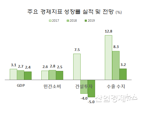 [산업경제뉴스 문성희 기자] 그동안 우리 경제를 떠받치던 반도체와 건설 산업이 하락세로 전환하면서 올해 성장률이 지난해 2.7%보다 0.3%포인트 하락한 2.4%가 될 것이라는 전망이 나왔다.