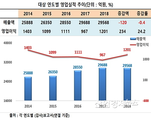 2018년 연결 매출, 전년비 120억 감소 2조9567억 시현..역대 2번째