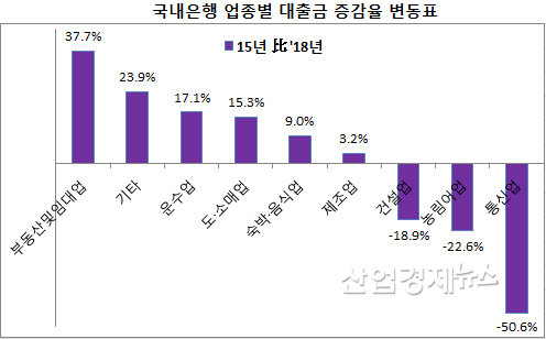 [산업경제뉴스 김소산 기자] 특수은행·시중은행·지방은행으로 분류되는 국내은행들의 최근 3년간 대출금 지원규모가 가장 컸던 업종은 부동산·임대업으로 조사됐다.