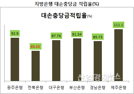 [산업경제뉴스 김소산 기자] JB금융지주의 계열사인 전북은행이 그간의 부실여신 발생에 대비한 대손충당금 적립비율이 65.1%에 그치면서 국내 지방은행 중 최저치를 기록한 것으로 나타났다.