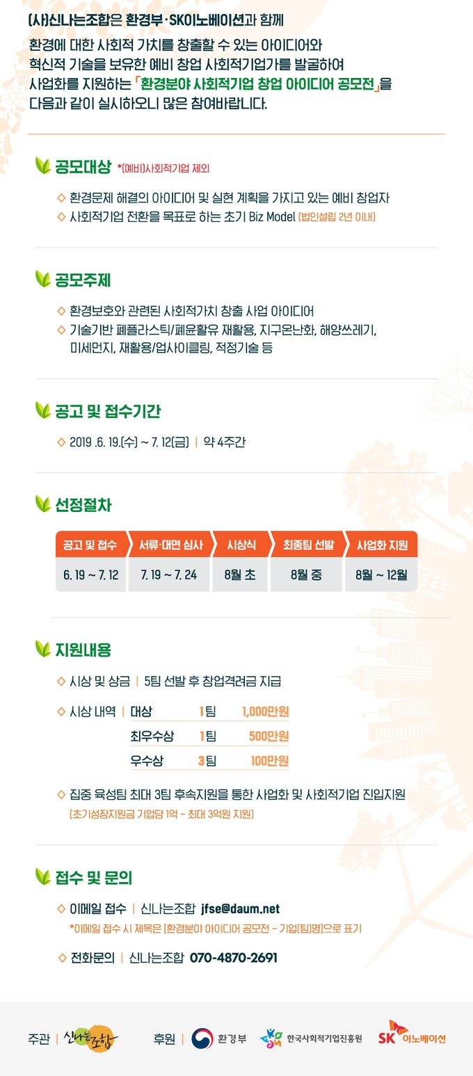 이번 공모전은 비영리단체인 (사)신나는조합이 주관하고 환경부, 한국사회적기업진흥원, SK이노베이션이 후원한다.