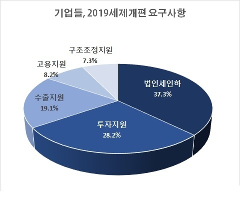 응답기업 가운데 37.3%의 기업이 법인세인하를 꼽아서 1위를 차지했다. 그 다음은 투자활성화를 위한 지원으로 28.2%를 차지해 두 번째로 많은 기업이 투자활성화 지원을 요구했다.