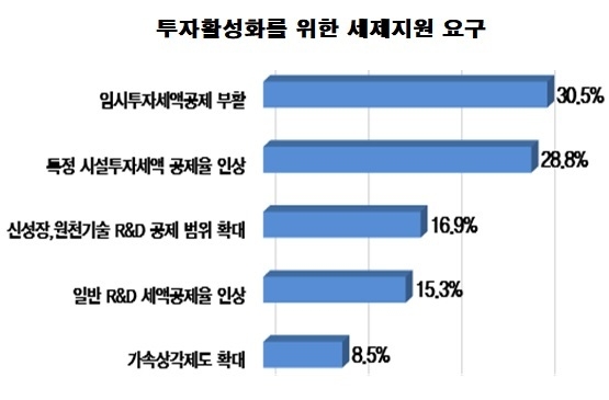 기업들은 투자를 늘리기 위해서는 '임시투자세액공제'를 부활시켜야 한다는 의견이 30.5%로 가장 많았다. 그 다음은 '특정 시설투자세액 공제율 인상'으로 28.8%의 기업이 인상 필요성을 강조했다.