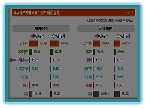 이러한 와중에도 제조사별 매출액과 브랜드별 매출 모두 OB맥주가 압도적 우위로 시장을 호령중인 것으로 드러났으며, 롯데칠성주류의 맥주 부문 매출은 롯데그룹 위상에 비해 너무도 초라한 성적표를 내밀어 대조를 보였다.