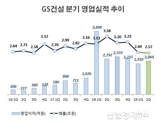 GS건설은 지난달 2019년 2분기 잠정영업실적을 발표했다. 매출은 2조5740억원, 영업이익은 2064억원, 당기순이익은 1456억원을 기록했다.