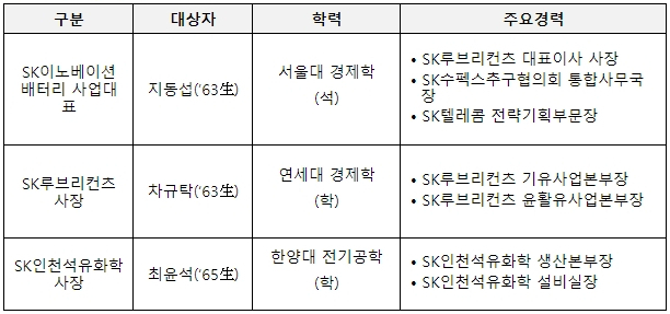 SK루브리컨츠 사장에는 차규탁 SK루브리컨츠 기유사업본부장이 신규 선임됐다. 또, SK인천석유화학 사장에는 최윤석 생산본부 본부장이 각각 신규 선임되었다.