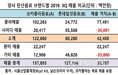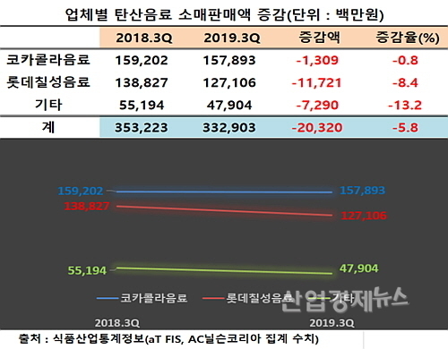 롯데칠성이 2018년 3분기 507억에서 지난해 3분기 468억으로 약 39억이 준 반면, 코카콜라사는 379.9억에서 352.1억으로 약 27.8억 원 감소에 그쳐, 롯데보다 감소폭이 적었다.