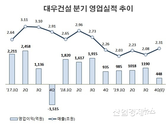 대우건설은 지난 31일 2019년 연결기준 잠정 경영실적을 공시했다. 공시에 따르면 대우건설은 지난해 매출 8조 6519억원, 영업이익 3641억원, 당기순이익 2012억 원의 실적을 기록했다.
