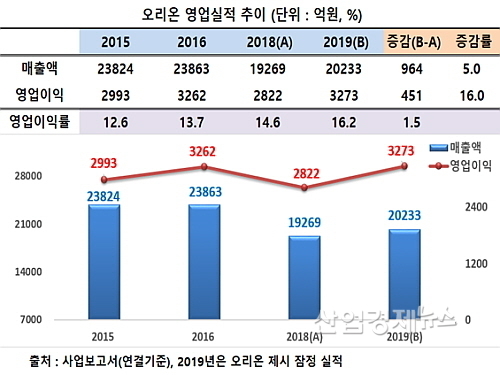 오리온이 최근 보도자료를 통해 밝힌 2019년 잠정 영업실적에 따르면 먼저 외형은 2조233억 원의 연결 매출을 시현, 전년도 1조9269억 대비 약 5.0% 성장했다.