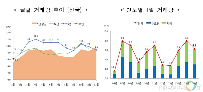 금년 1월 주택매매거래량이 전년동월 대비 크게 감소한 것은, 2015년 1월 거래량이 시장 기대심리 회복 등으로 2006년 통계집계 이후 최대치(7.9만건)를 기록한 데 따른 기저효과(base effect)로 분석된다.