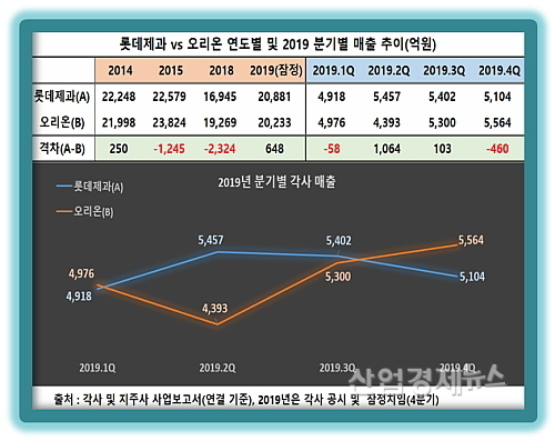 양사의 지난해 매 분기보고서 및 2019년 잠정 영업실적에 따르면 롯데제과는 국내외 종속법인의 실적을 반영한 연결재무제표 기준 총 2조881억 원의 누적매출을 시현, 2조233억 매출에 그친 오리온을 648억 원 가량 앞서며 업계 1위 자리 탈환에 성공했다.
