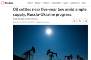 [산업경제뉴스 손영남 기자] 국제 유가가 지정학적 긴장 완화와 경기 둔화라는 상반된 요인이 동시에 작용하면서 하락세를 이어갔다. 러시아와 우크라이나 간 평화 협상이 진전을 보이며 공급 확대 기대가 커진 가운데, 세계 최대 원유 수입국인 중국의 부진한 경제 지표가 수요 감소 우려를 부각시켰다. <로이터>는 17일 이같은 내용을 전하며 국제 유가의 하락 전환을 짚고 나섰다. 보도에 따르면 12월 16일 브렌트유와 WTI 가격은 모두 소폭 하락하며 이러한 흐름을 드러내고 있는 것으로 알려졌다. 실제로 브렌트유는 배럴당 60.32달러로 전일 대비 0.4% 떨어졌고, 미국 서부텍사스산 원유(WTI)는 56.60달러로 0.39% 하락했다. 이는 시장이 러시아 제재 완화 가능성에 따른 공급 증가 기대와 중국 경기 둔화로 인한 수요 감소 우려를 동시에 반영한 결과다. 로이터는 이런 시장 흐름을 이끈 주요인으로 러시아-우크라이나 협상 진전을 꼽았다. 전쟁 종전에 따른 제재 완화 가능성의 상승이 러시아산 원유의 증산을 이끌 지도 모른다는 기대감 때문이라는 것. 리시아산 원유가 다시 국제 시장에 더 많이 공급될 수 있다는 전망은 투자자들에게 가격 하락 압력으로 작용했