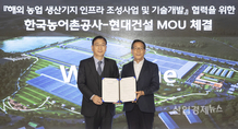 [산업경제뉴스 강민구 기자] 현대건설이 친환경 지능형 농장 K-스마트팜1) (Smart farm)의 기술역량을 강화하고 해외 시장 진출에 적극 나선다. 현대건설은 서울 종로구 계동에 위치한 현대건설 본사에서 한국농어촌공사와 ‘스마트 농업 기반 조성 및 해외진출을 위한 전략적 업무협약(MOU)‘을 체결했다고 20일 밝혔다. 이날 서명식은 현대건설 윤영준 사장, 한국농어촌공사 이병호 사장 등 양사 주요 경영진이 참석한 가운데 이뤄졌다. 이번 협약에는 ▲해외 농업 생산기지 인프라 조성사업 ▲스마트시티 사업과 연계한 한국형 스마트팜 해외 진출 ▲친환경 스마트팜 공동연구 추진 등 차세대 농업 분야 경쟁력 확보를 위한 구체적인 협력 내용이 담겼다. 양사는 금번 협약을 통해 해외 농업 생산기지 인프라 조성사업을 본격화하기로 했다. 현대건설은 중동 및 동남아 지역의 풍부한 프로젝트 수행 경험으로 축적한 관개수로, 저수지, 에너지, 해수담수화 등 인프라 개발 사업 노하우를 공유하고 한국농어촌공사는 국가 농업 생산을 기반으로 구축한 민·관 해외 농업 투자플랫폼을 통해 협력할 예정이다. 또한, 현대건설은 현재 추진 중인 해외 스마트시티 개발사업에 한국농어촌공사가 보유한 스마트팜